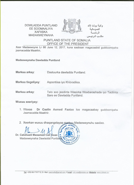 Dr. Caalin Axmed Faatax ayaa madaxweynaha Puntland C/weli Gaas u magcaabay Guddoomiyaha Jaamacadda Maakhir. Arag qoraalka hoose.